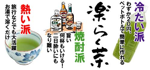 ![]() | ●少し濃いめに作った楽らく茶(300〜400cc)で焼酎等で割ってお召し上がり下さい。 二日酔いにもなりにくい 緑茶には、アルコールを分解するカフェインやカフェインの働きを促進するビタミンCが含まれています。 その上茶の葉をそのまま微粉末にした本品は本来茶殻に残ってしまう食物繊維・カロチン・ビタミンE・クロロフィル等の成分も無駄なく摂取できます。 二日酔いや健康の気になる方へ緑茶で割って美味しく健康を!焼酎の他、ウィスキーや日本酒にもどうぞ ![]() | |||